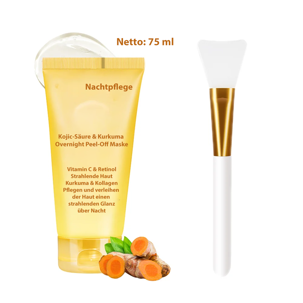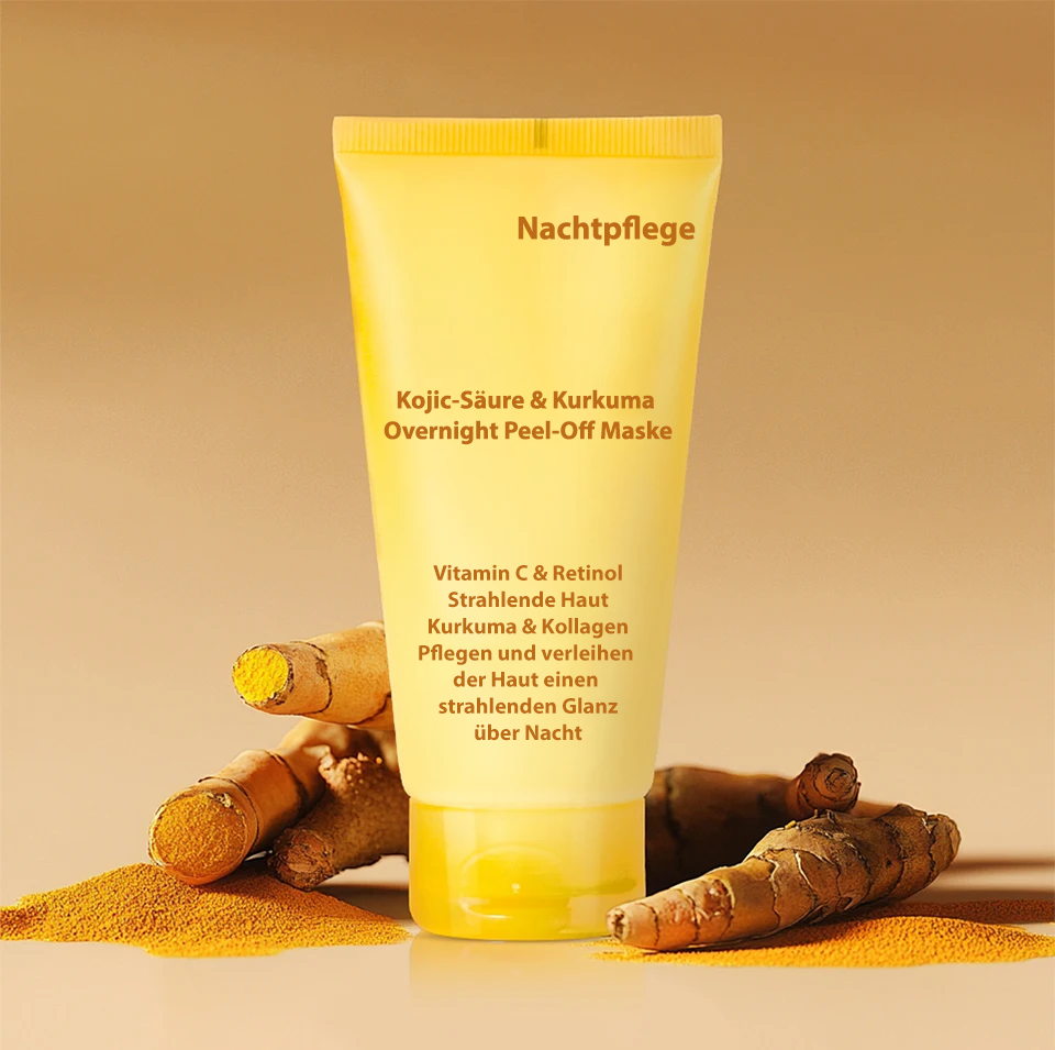 Kojic-Säure, ein bewährter Wirkstoff in der Hautpflege, hemmt nachweislich die Melaninproduktion und trägt zu einem gleichmäßigeren, helleren Teint bei. Kurkuma wirkt stark antioxidativ und beruhigt die Haut, während Kollagen und Hyaluronsäure für intensive Feuchtigkeit und Straffung sorgen. Die sanfte Peel-Off-Textur bildet über Nacht eine atmungsaktive Schicht, die Wirkstoffe und Feuchtigkeit in der Haut einschließt – für ein sichtbar erfrischtes und strahlendes Hautbild am Morgen.